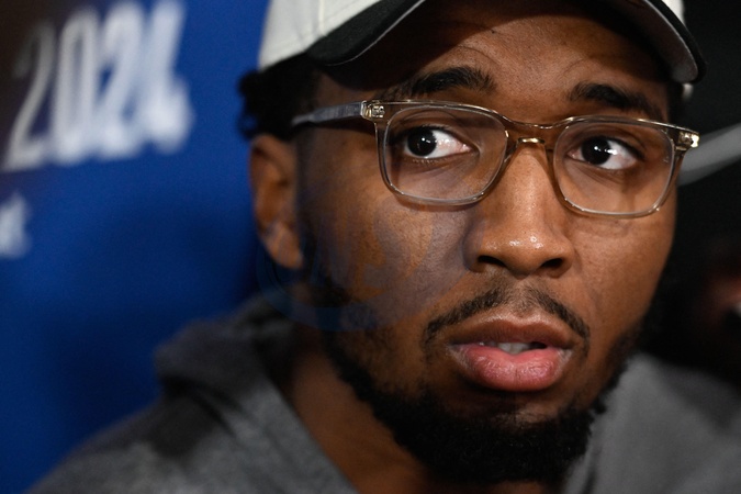 Donovan Mitchell ( 45 - Cleveland Cavaliers ) during the Cleveland Cavaliers press conference at Palais des Sports Marcel Cerdan on January 10, 2024 in Levallois, France. © Federico Pestellini / Panoramic / Bestimage