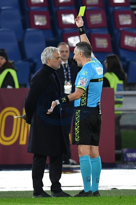 Referee Gianluca Aureliano shows the yellow card to Roma trainer Jose Mourinho during the Serie A match between Roma v Atalanta at Olympic stadium, Italy, January 07th, 2024. AllShotLive, Credit:AllShotLive / Avalon