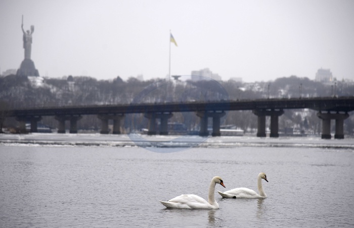 Swans on Dnipro embankment in Kyiv