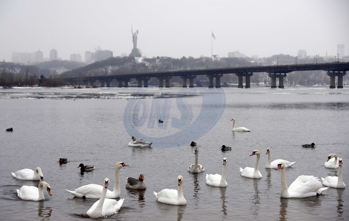 KYIV, UKRAINE - JANUARY 06, 2024 - Ducks and swans swim in the Dnipro River on Dnipro embankment, Kyiv, capital of Ukraine., Credit:Ruslan Kanuka / Avalon