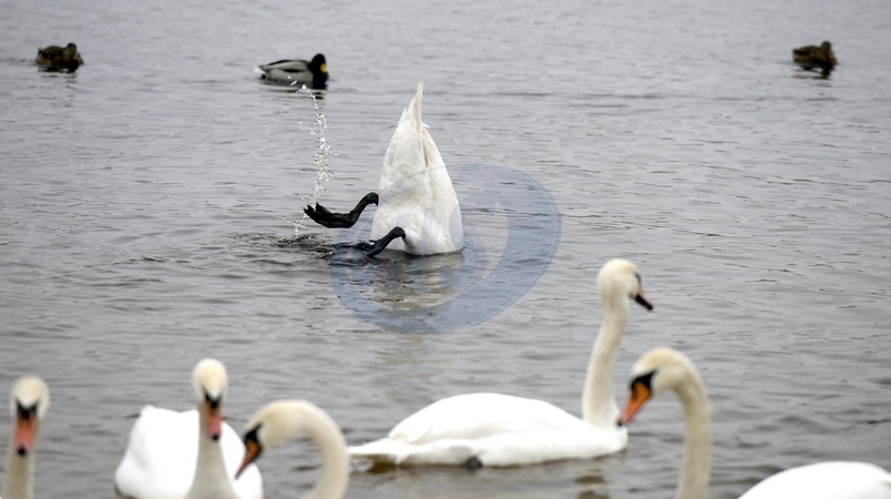 KYIV, UKRAINE - JANUARY 06, 2024 - Ducks and swans swim in the Dnipro River on Dnipro embankment, Kyiv, capital of Ukraine., Credit:Ruslan Kanuka / Avalon