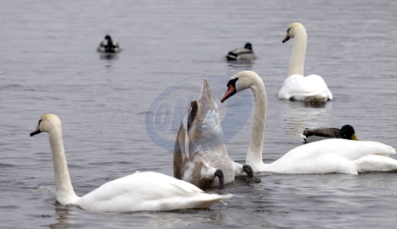 KYIV, UKRAINE - JANUARY 06, 2024 - Ducks and swans swim in the Dnipro River on Dnipro embankment, Kyiv, capital of Ukraine., Credit:Ruslan Kanuka / Avalon