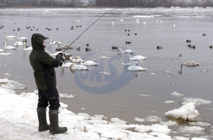 KYIV, UKRAINE - JANUARY 06, 2024 - A man goes fishing in the Dnipro River, where ducks and swans swim, on Dnipro embankment, Kyiv, capital of Ukraine., Credit:Ruslan Kanuka / Avalon