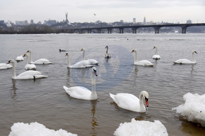 KYIV, UKRAINE - JANUARY 06, 2024 - Swans swim in the Dnipro River on Dnipro embankment, Kyiv, capital of Ukraine, Credit:Ruslan Kanuka / Avalon