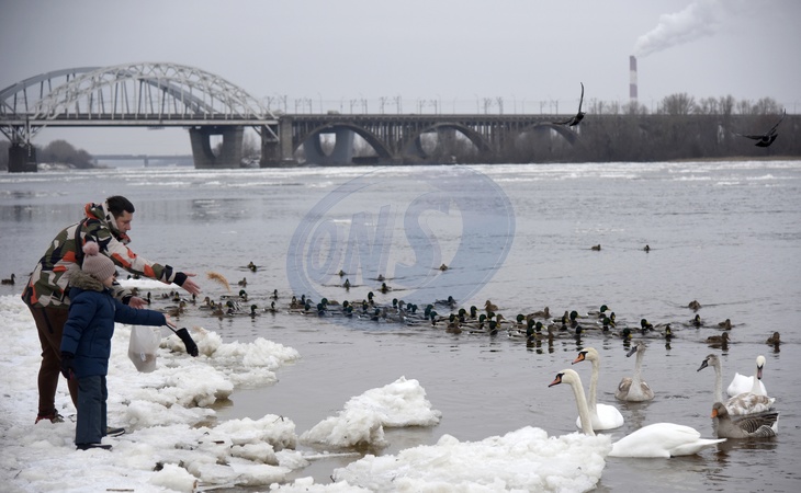 KYIV, UKRAINE - JANUARY 06, 2024 - A man with a child feed ducks and swans that swim in the Dnipro River on Dnipro embankment, Kyiv, capital of Ukraine., Credit:Ruslan Kanuka / Avalon