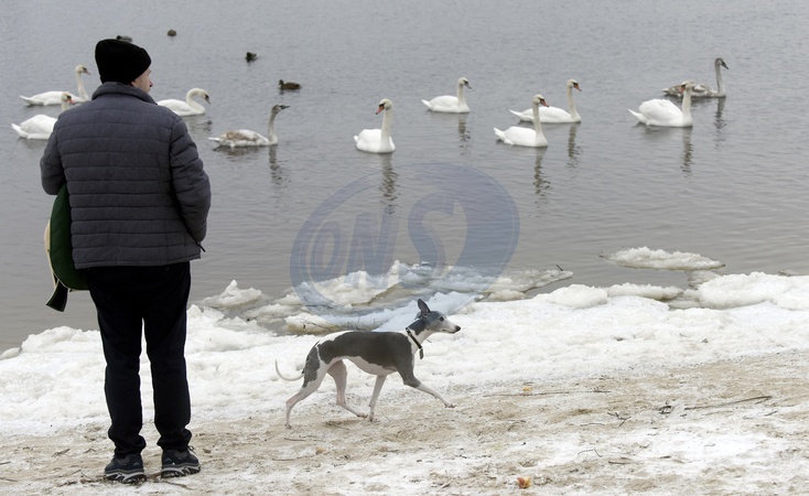 KYIV, UKRAINE - JANUARY 06, 2024 - A man walks a dog along the Dnipro River, where swans and ducks swim, Kyiv, capital of Ukraine., Credit:Ruslan Kanuka / Avalon