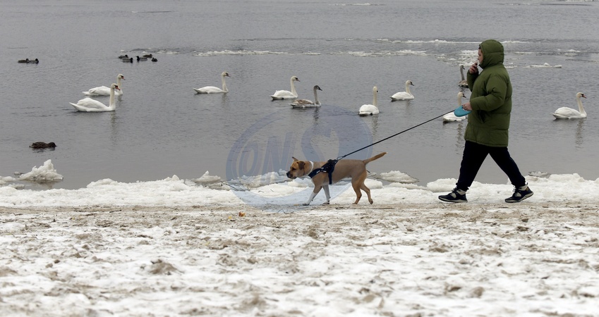 KYIV, UKRAINE - JANUARY 06, 2024 - A man walks a dog along the Dnipro River, where swans and ducks swim, Kyiv, capital of Ukraine., Credit:Ruslan Kanuka / Avalon