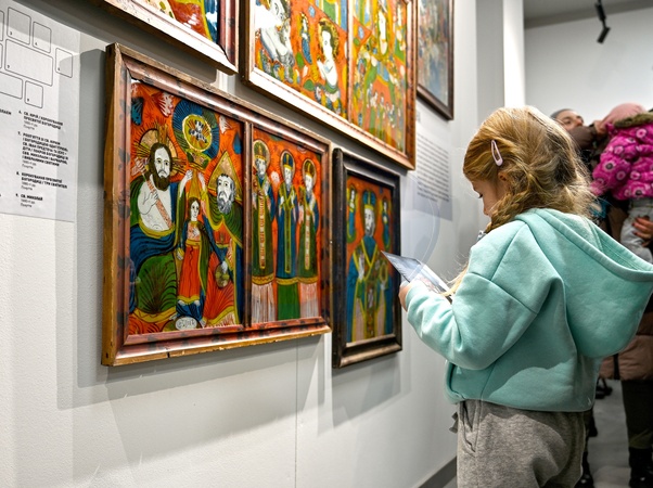 LVIV, UKRAINE - JANUARY 06, 2024 - A girl is seen during the opening of the exhibition of folk icons on glass from the collection of Ostap Lozynskyi "More Fragile than Glass" at the Klymentii Sheptytskyi Museum of Folk Architecture and Rural Life, Lviv, western Ukraine., Credit:Anastasiia Smolienko / Avalon