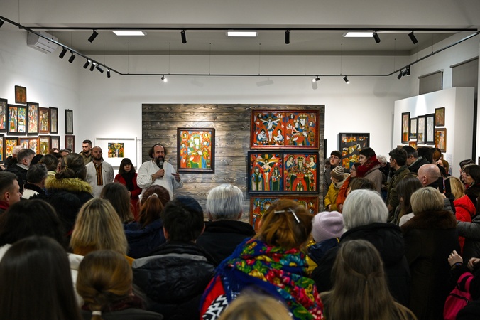 LVIV, UKRAINE - JANUARY 06, 2024 - Curator Roma Zilinko (C) speaks during the opening of the exhibition of folk icons on glass from the collection of Ostap Lozynskyi "More Fragile than Glass" at the Klymentii Sheptytskyi Museum of Folk Architecture and Rural Life, Lviv, western Ukraine., Credit:Anastasiia Smolienko / Avalon