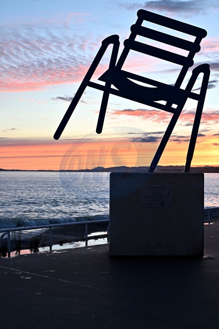 Illustration d'un coucher de soleil sur la Promenade des Anglais à Nice, le 6 janvier 2024. Ici, la Chaise Bleue de SAB. © Bruno Bebert / Bestimage Illustration of a sunset on the Promenade des Anglais in Nice in January 2024.