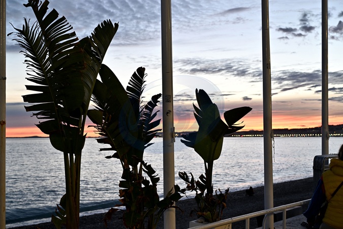 Illustration d'un coucher de soleil sur la Promenade des Anglais à Nice, le 6 janvier 2024. © Bruno Bebert / Bestimage Illustration of a sunset on the Promenade des Anglais in Nice in January 2024.