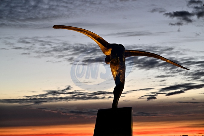 Illustration d'un coucher de soleil sur la Promenade des Anglais à Nice, le 6 janvier 2024. Ici, l'œuvre mémorielle "L'Ange de la Baie" de l'artiste Jean-Marie Fondacaro en hommage aux victimes de l'attentat du 14 juillet 2016. © Bruno Bebert / Bestimage Illustration of a sunset on the Promenade des Anglais in Nice in January 2024.