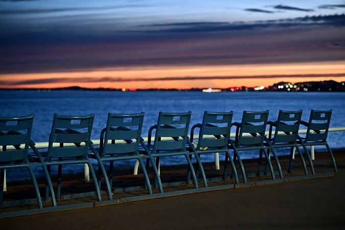 Illustration d'un coucher de soleil sur la Promenade des Anglais à Nice, le 6 janvier 2024. Ici, les fameuses chaises bleues de la Prom'. © Bruno Bebert / Bestimage Illustration of a sunset on the Promenade des Anglais in Nice in January 2024.