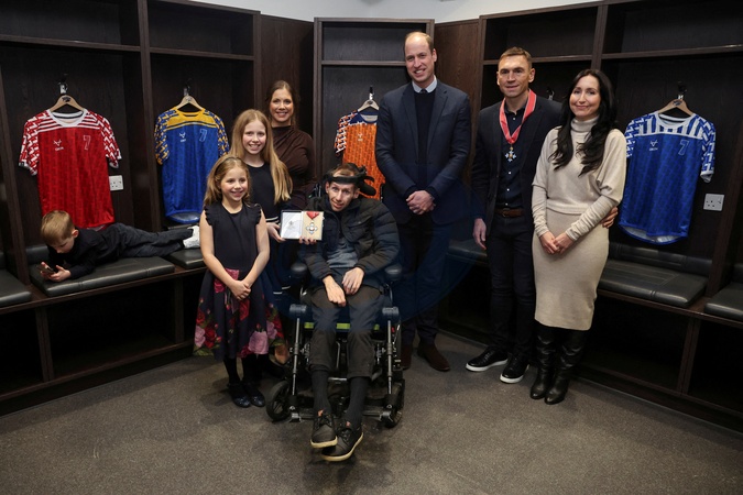 Britain's Prince of Wales William meets rugby coach Kevin Sinfield and former rugby league player Rob Burrow to congratulate and award them with the Commander of the British Empire (CBE) for raising awareness of Motor Neurone Disease, during his visit to the Headingley Stadium in Leeds, Britain, January 11, 2024., Credit:PHIL NOBLE / Avalon