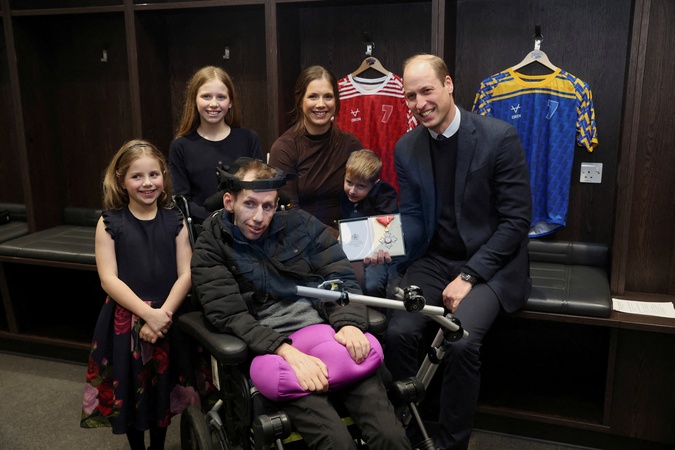 Britain's Prince of Wales William meets former rugby league player Rob Burrow to congratulate and award him with the Commander of the British Empire (CBE) for raising awareness of Motor Neurone Disease, during his visit to the Headingley Stadium in Leeds, Britain, January 11, 2024., Credit:PHIL NOBLE / Avalon