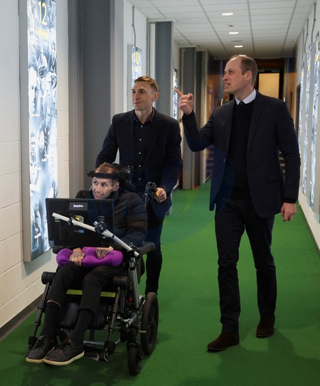 Britain's Prince of Wales William meets former rugby league player Rob Burrow to congratulate and award him with the Commander of the British Empire (CBE) for raising awareness of Motor Neurone Disease, during his visit to the Headingley Stadium in Leeds, Britain, January 11, 2024., Credit:PHIL NOBLE / Avalon