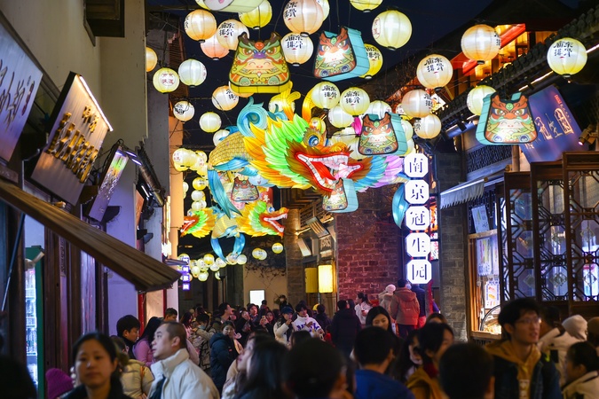 People admire lanterns during the annual Qinhuai Lantern Show in Nanjing in east China's Jiangsu province Thursday, Jan. 11, 2024., Credit:FANG DONGXU / Avalon
