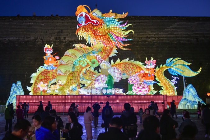 People admire a dragon lantern during the annual Qinhuai Lantern Show in Nanjing in east China's Jiangsu province Thursday, Jan. 11, 2024., Credit:FANG DONGXU / Avalon