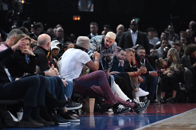 Célébrités assistent au match de basket de NBA entre les Cavs de Cleveland contre les Brooklyn Nets (111-102) à l'Accor Arena à Paris