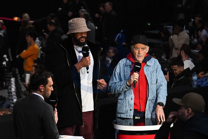 Célébrités assistent au match de basket de NBA entre les Cavs de Cleveland contre les Brooklyn Nets (111-102) à l'Accor Arena à Paris le 11 janvier 2024. Joakim Noah and George Eddy during the NBA Paris Game 2024 between Brookly Nets vs Cleveland Cavaliers at Accor Arena on January 11, 2024 in Paris, France. ( Photo by federico pestellini / panoramic ) -