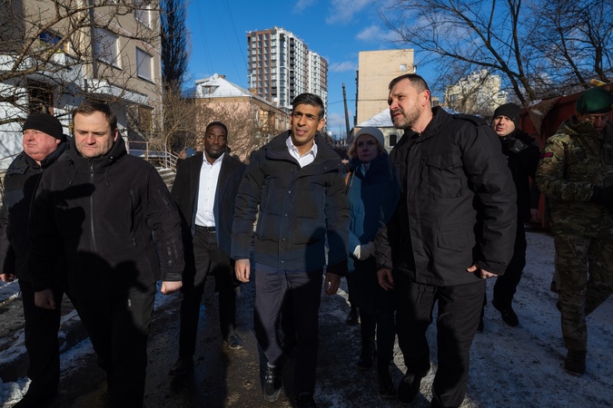 12/01/2024. , Ukraine. The Prime Minister Rishi Sunak visits a bomb damaged building in Ukraine and meets local residents and emergency workers., Credit:Simon Walker / Avalon