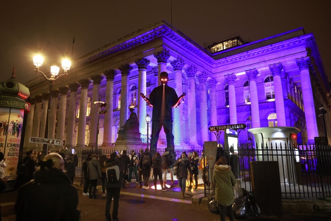 Une statue géante éphémère du rappeur américain Kid Cudi installée place de la Bourse pour fêter son nouvel album, à Paris vendredi 12 janvier 2024 A giant ephemeral statue of American rapper Kid Cudi installed at Place de la Bourse to celebrate his new album, in Paris Friday January 12, 2024