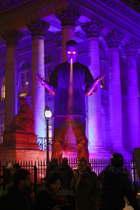 Gigantyczny efemeryczny pomnik amerykańskiego rapera Kid Cudi zainstalowany na Place de la Bourse z okazji jego nowego albumu w Paryżu