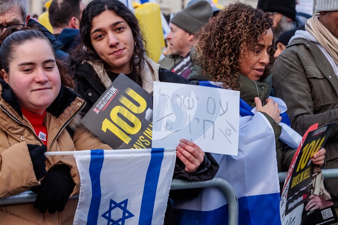 Trafalgar Square, London, UK. 14th January 2024.Thousands of people joined Solidarity With Israel rally held in London to mark 100 days since the terrorist attack on Israel by Hamas. The event included a range of speakers, including family members of some of the 136 hostages still held captive, and musical performances by Israeli artists.1,400 Israelis were brutally murdered and 240 hostages were taken when Hamas invaded Israel on 7th Oct 2023., Credit:Photo by Amanda Rose / Avalon