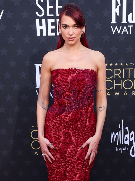 SANTA MONICA, LOS ANGELES, CALIFORNIA, USA - JANUARY 14: Dua Lipa wearing a custom Prada dress, Prada shoes and bag, and Tiffany and Co. jewelry arrives at the 29th Annual Critics' Choice Awards held at The Barker Hangar on January 14, 2024 in Santa Monica, Los Angeles, California, United States., Credit:Xavier Collin / Avalon