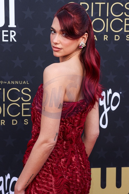 SANTA MONICA, LOS ANGELES, CALIFORNIA, USA - JANUARY 14: Dua Lipa wearing a custom Prada dress, Prada shoes and bag, and Tiffany and Co. jewelry arrives at the 29th Annual Critics' Choice Awards held at The Barker Hangar on January 14, 2024 in Santa Monica, Los Angeles, California, United States., Credit:Xavier Collin / Avalon
