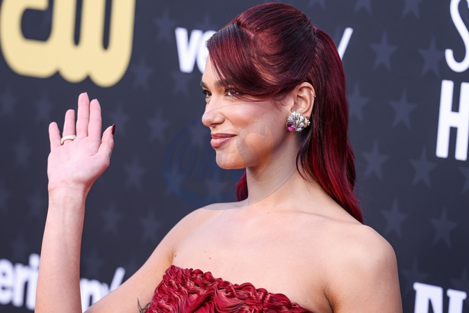 SANTA MONICA, LOS ANGELES, CALIFORNIA, USA - JANUARY 14: Dua Lipa wearing a custom Prada dress, Prada shoes and bag, and Tiffany and Co. jewelry arrives at the 29th Annual Critics' Choice Awards held at The Barker Hangar on January 14, 2024 in Santa Monica, Los Angeles, California, United States., Credit:Xavier Collin / Avalon