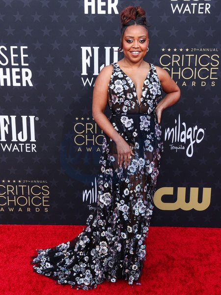 SANTA MONICA, LOS ANGELES, CALIFORNIA, USA - JANUARY 14: Quinta Brunson wearing Georges Hobeika and Nicole Rose jewelry arrives at the 29th Annual Critics' Choice Awards held at The Barker Hangar on January 14, 2024 in Santa Monica, Los Angeles, California, United States., Credit:Xavier Collin / Avalon