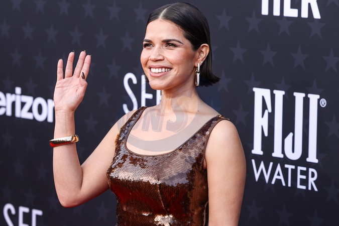 SANTA MONICA, LOS ANGELES, CALIFORNIA, USA - JANUARY 14: America Ferrera wearing a custom Alberta Ferretti dress with Pomellato jewelry and a Tyler Ellis clutch arrives at the 29th Annual Critics' Choice Awards held at The Barker Hangar on January 14, 2024 in Santa Monica, Los Angeles, California, United States., Credit:Xavier Collin / Avalon