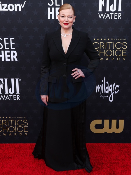 SANTA MONICA, LOS ANGELES, CALIFORNIA, USA - JANUARY 14: Sarah Snook wearing a custom Cong Tri dress, Manolo Blahnik shoes, a Tyler Ellis bag, and Bucherer jewelry arrives at the 29th Annual Critics' Choice Awards held at The Barker Hangar on January 14, 2024 in Santa Monica, Los Angeles, California, United States., Credit:Xavier Collin / Avalon