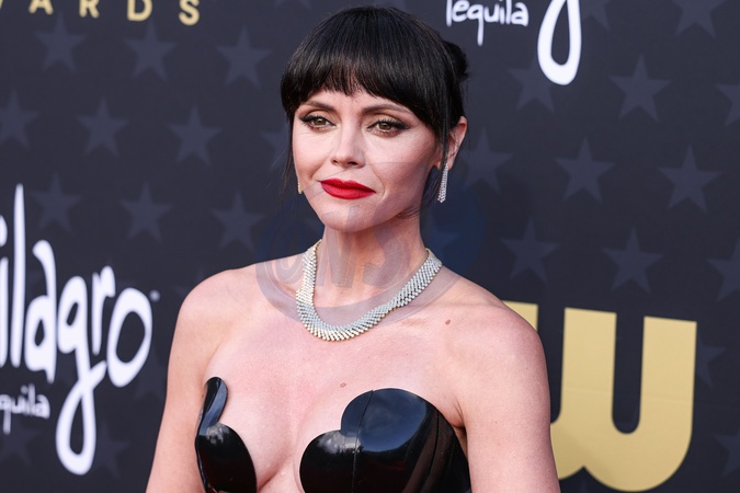 SANTA MONICA, LOS ANGELES, CALIFORNIA, USA - JANUARY 14: Christina Ricci wearing a custom Astsuko dress, Tamara Mellon shoes, a Carolina Herrera bag, and Bucherer jewelry arrives at the 29th Annual Critics' Choice Awards held at The Barker Hangar on January 14, 2024 in Santa Monica, Los Angeles, California, United States., Credit:Xavier Collin / Avalon