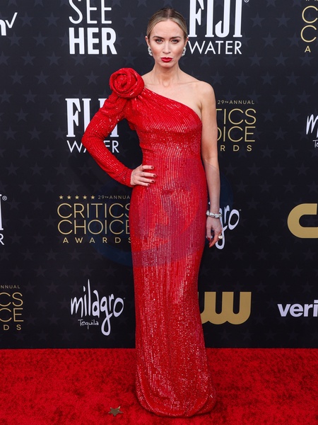 SANTA MONICA, LOS ANGELES, CALIFORNIA, USA - JANUARY 14: Emily Blunt wearing a Giorgio Armani Prive dress, Alexander Birman shoes, a Tyler Ellis clutch, and Tiffany and Co. jewelry arrives at the 29th Annual Critics' Choice Awards held at The Barker Hangar on January 14, 2024 in Santa Monica, Los Angeles, California, United States., Credit:Xavier Collin / Avalon