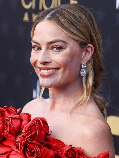 SANTA MONICA, LOS ANGELES, CALIFORNIA, USA - JANUARY 14: Margot Robbie wearing custom Balmain arrives at the 29th Annual Critics' Choice Awards held at The Barker Hangar on January 14, 2024 in Santa Monica, Los Angeles, California, United States., Credit:Xavier Collin / Avalon