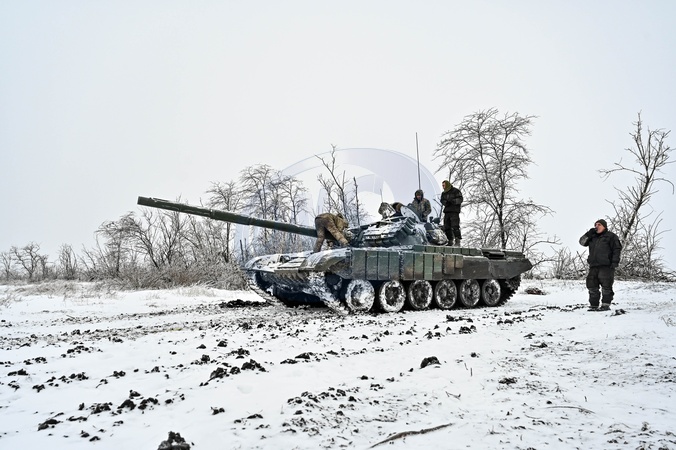 ZAPORIZHZHIA SECTOR, UKRAINE - JANUARY 11, 2024 - A T-72 tank is seen during special training of the soldiers of the 128th separate mountain assault brigade of the Zakarpattia Army of the Armed Forces of Ukraine to maintain professional skills, Zaporizhzhia sector, south-eastern Ukraine., Credit:Dmytro Smolienko / Avalon