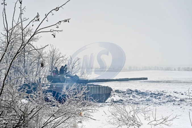 ZAPORIZHZHIA SECTOR, UKRAINE - JANUARY 11, 2024 - A T-72 tank is seen during special training of the soldiers of the 128th separate mountain assault brigade of the Zakarpattia Army of the Armed Forces of Ukraine to maintain professional skills, Zaporizhzhia sector, south-eastern Ukraine., Credit:Dmytro Smolienko / Avalon