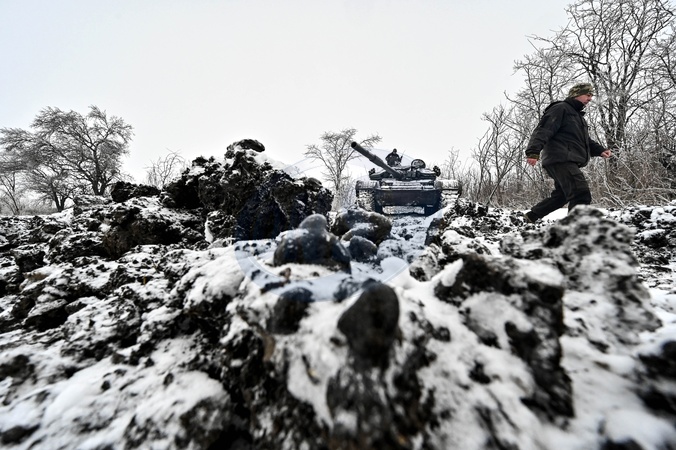ZAPORIZHZHIA SECTOR, UKRAINE - JANUARY 11, 2024 - A T-72 tank is seen during special training of the soldiers of the 128th separate mountain assault brigade of the Zakarpattia Army of the Armed Forces of Ukraine to maintain professional skills, Zaporizhzhia sector, south-eastern Ukraine., Credit:Dmytro Smolienko / Avalon