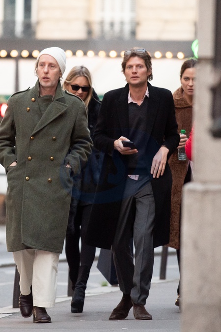 Exclusif - Le jour de son 50ème anniversaire Kate Moss, accompagnée de son compagnon Nikolai von Bismarck et de son coiffeur James Brown, sort d'une séance d'essayage pour la Fashion Week de Paris (PFW), à Paris, rance, le 16 janvier 2024. No Web pour la Belgique et la Suisse Exclusive - For Germany Call For Price - The day of her 50th anniversary Kate Moss, accompanied by her companion Nikolai von Bismarck and her hairdresser James Brown, comes out of a fitting session for fashion week in Paris (PFW), in Paris, Rance, January 16, 2024.