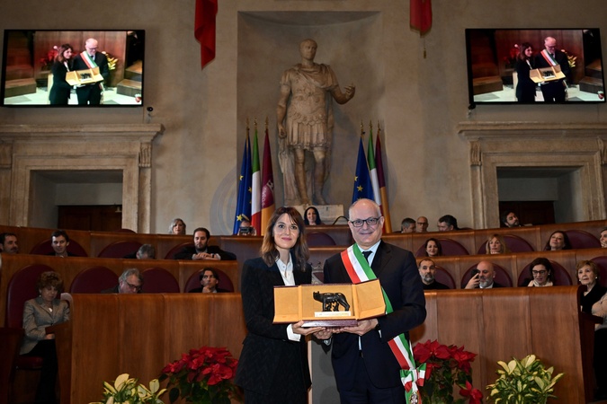 The mayor of Rome Roberto Gualtieri delivers the Capitoline Wolf award to the actress Paola Cortellesi, in recognition of her artistic career. Rome, Italy, 01/16/2024, Credit:Maria Laura Antonelli / Avalon