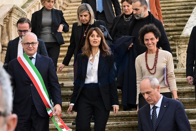 The mayor of Rome Roberto Gualtieri delivers the Capitoline Wolf award to the actress Paola Cortellesi, in recognition of her artistic career. Rome, Italy, 01/16/2024, Credit:Maria Laura Antonelli / Avalon