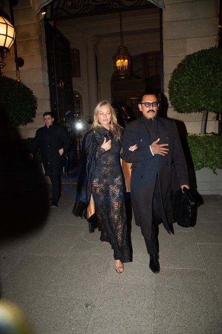 Le jour de son 50ème anniversaire Kate Moss, accompagnée de son compagnon Nikolai von Bismarck et ses amis, sort de l’hôtel Ritz pour se rendre au restaurant "Laurent" à Paris
