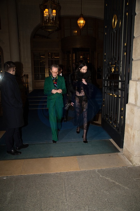 Le jour de son 50ème anniversaire Kate Moss, accompagnée de son compagnon Nikolai von Bismarck et ses amis, sort de l’hôtel Ritz pour se rendre au restaurant "Laurent" à Paris