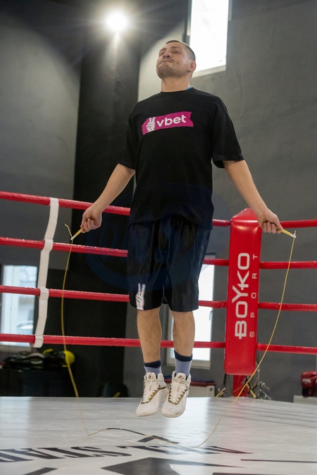 KYIV, UKRAINE - JANUARY 16, 2024 - Boxer, WBO International lightweight champion Denys Berinchyk jumps over a skipping rope during an open training session, Kyiv, capital of Ukraine., Credit:Pavlo_Bagmut / Avalon