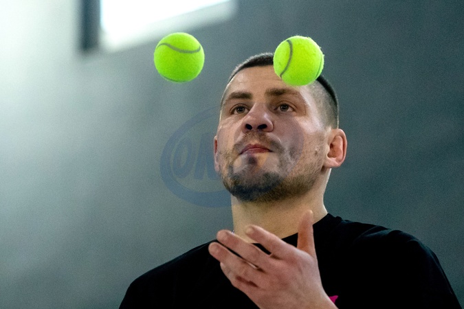 KYIV, UKRAINE - JANUARY 16, 2024 - Boxer, WBO International lightweight champion Denys Berinchyk juggles tennis balls during an open training session, Kyiv, capital of Ukraine., Credit:Pavlo_Bagmut / Avalon