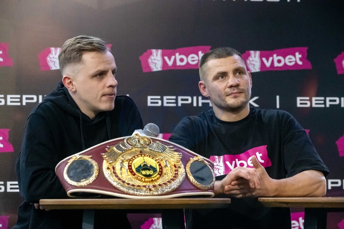 KYIV, UKRAINE - JANUARY 16, 2024 - Boxer, WBO International lightweight champion Denys Berinchyk (R) and his coach Yehor Holub are pictured with a champion's belt during a press conference, Kyiv, capital of Ukraine., Credit:Pavlo_Bagmut / Avalon