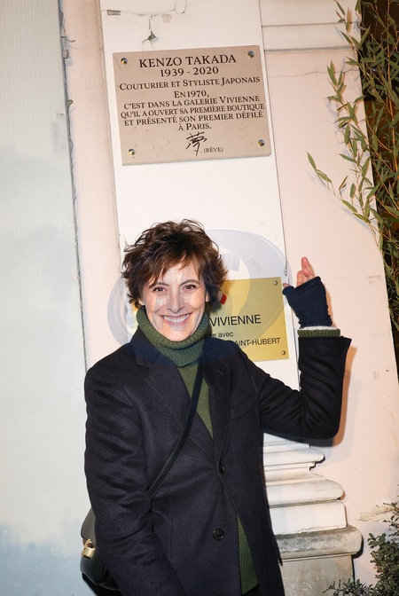 Inès de La Fressange - Dévoilement d'une plaque en hommage à Kenzo Takada saluant l'héritage du créateur japonais décédé en 2020 devant la Galerie Vivienne à Paris le 16 janvier 2024. © Coadic Guirec/Bestimage Unveiling of a plaque in tribute to Kenzo Takada saluting the legacy of the Japanese designer who died in 2020 in front of the Galerie Vivienne in Paris on January 16, 2024.
