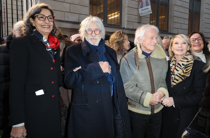 Pierre Richard et sa femme Ceyla Lacerda, Dave et Ruth Obadia - Dévoilement d'une plaque en hommage à Kenzo Takada saluant l'héritage du créateur japonais décédé en 2020 devant la Galerie Vivienne à Paris le 16 janvier 2024. © Coadic Guirec/Bestimage Unveiling of a plaque in tribute to Kenzo Takada saluting the legacy of the Japanese designer who died in 2020 in front of the Galerie Vivienne in Paris on January 16, 2024.